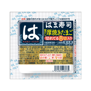 はま寿司の厚焼きたまごをご家庭で!かつおと昆布の2種類のだしで、うま味にこだわりました。 食べやすく8切にカットされています。