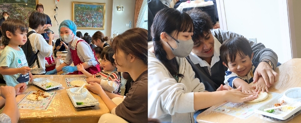 ハロウィンに合わせて可愛らしく飾り付けられた食堂で始まったピザイベント。当社社員による「ピザ作成デモンストレーション」で盛り上がった後に、メインイベントの「手作りピザ体験」がスタート。園児と家族で協力してピザ生地を伸ばしたり、準備された具材で思い思いのトッピングをしたりしてオリジナルのピザを完成させました。入居者も園児たちのそばに置かれたテーブルを囲んで、それぞれの方がこだわったオリジナルピザ作りを楽しまれました。