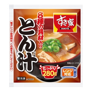 豚肉のうまみが溶け出した、すき家監修のとん汁です。8種類の具材を使用した食べ応えのある、たっぷり280gです。